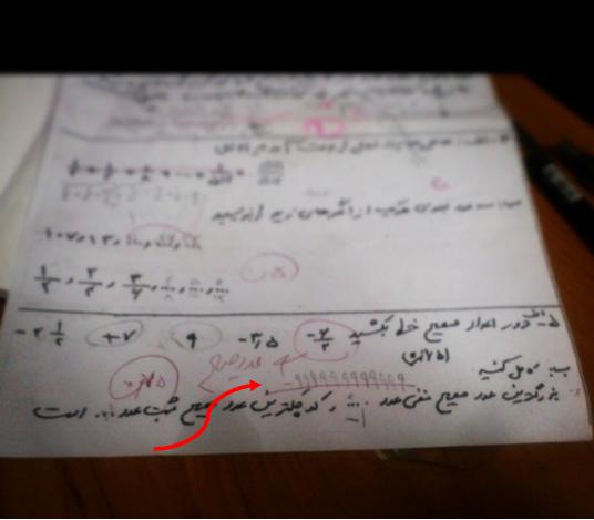 بهش میگم تا کجا میخواستی 9 بگذاری امیرعلی؟ واقعاً به فکرت نرسید اگر بزرگترین عدد صحیح منفی بخواد یه عالمه 9 داشته باشه، هر چی ادامه بدی باز فایده نداره؟ میگه: چرا خانم. وسطاش فهمیدم غلطه اما دیگه چارهای نداشتم؛ غرورم هم اجازه نداد عوضش کنم!!!